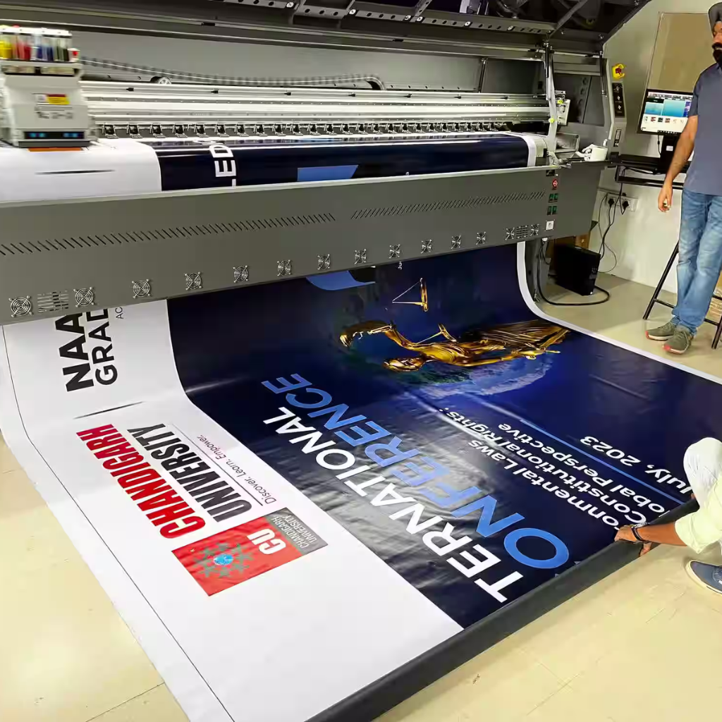 Flex printing is a digital printing technique used for large-scale banners, hoardings, and signage. It involves printing high-quality graphics on flexible PVC material, making it ideal for outdoor and indoor advertising.